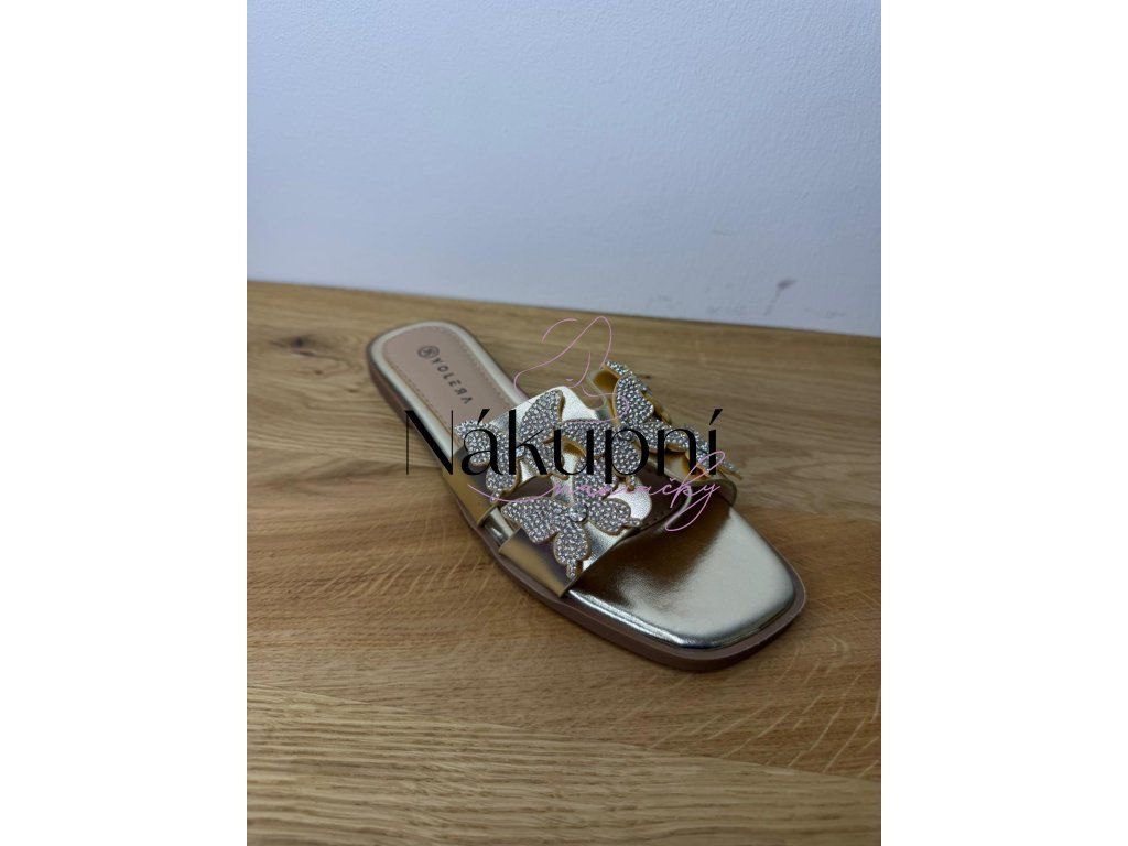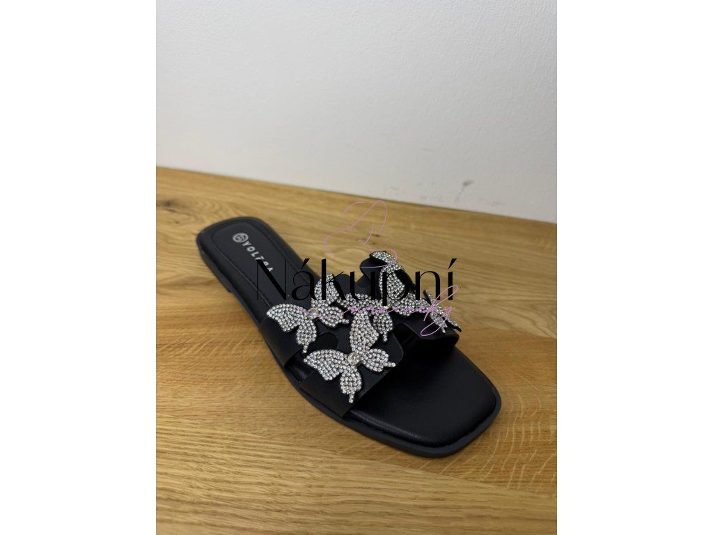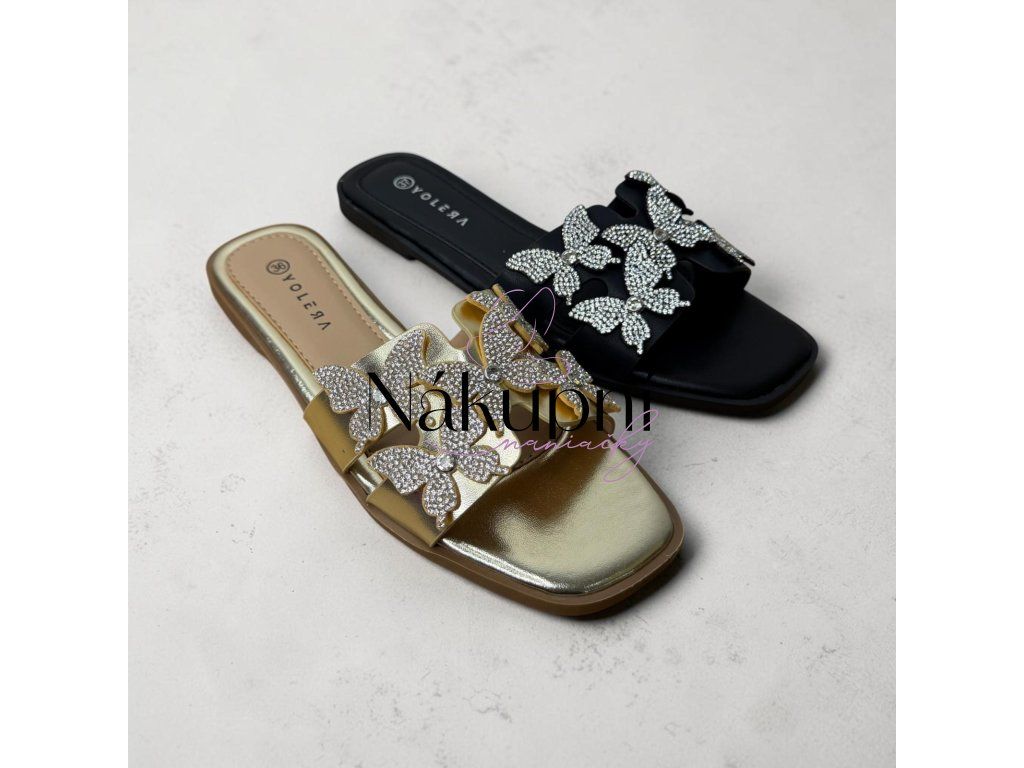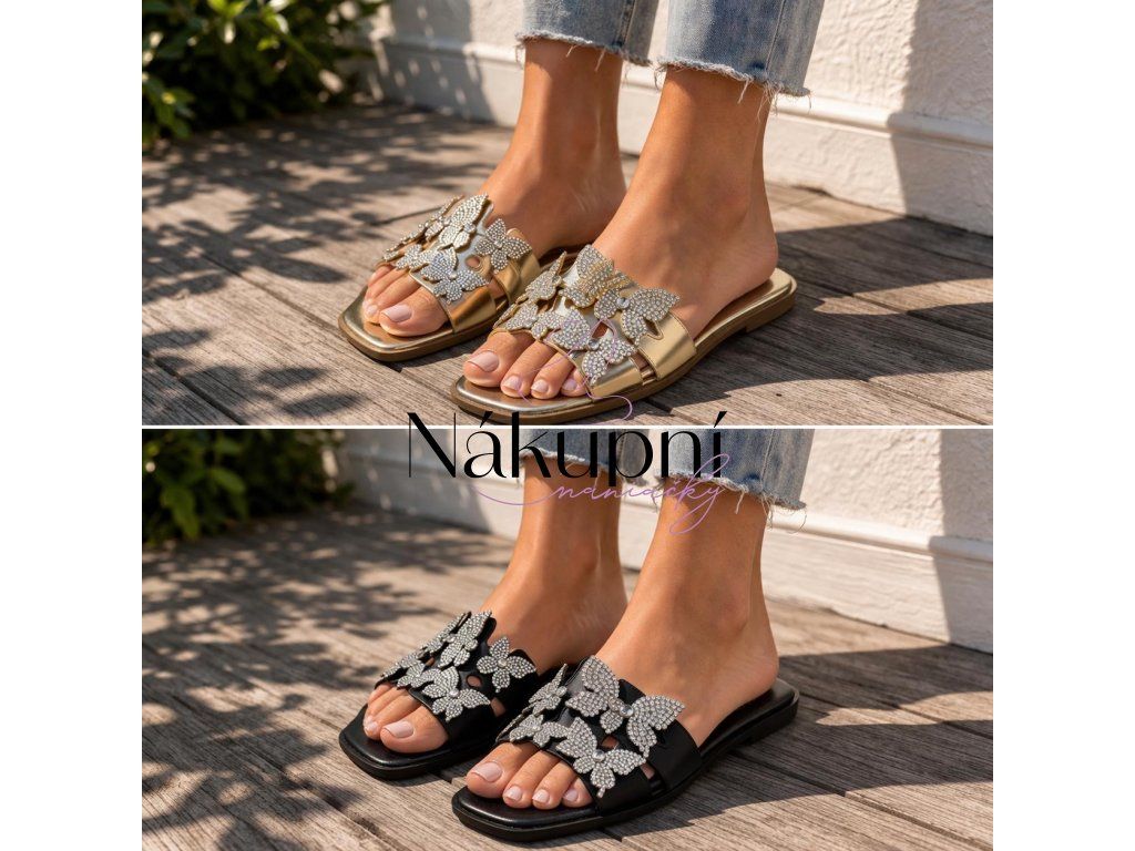 Lehkost motýlích křídel pro vaše nohy. Tyto stylové nazouváky na ploché podrážce kombinují minimalistický design s bohatým zdobením. Dominantní aplikace v podobě motýlů osázených třpytivými kamínky dodá každému vašemu kroku nádech luxusu a elegance, ať už jste na dovolené nebo ve městě.