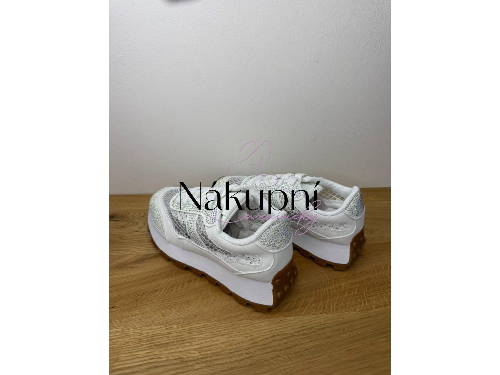Zářivý krok v každém okamžiku. Tyto prémiové bílé tenisky na lehké platformě jsou definicí moderního glamour stylu. Kombinace jemné stříbrné síťoviny a bohatého zdobení drobnými krystaly vytváří nepřehlédnutelný efekt, zatímco kontrastní hnědá podrážka dodává botám sportovní šmrnc.